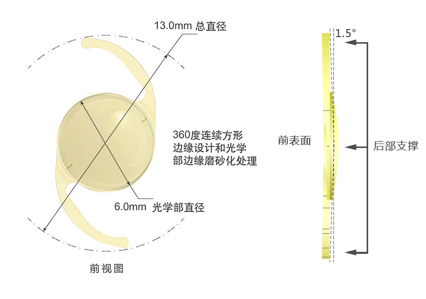 一件式后房人工晶状体,可折叠,襻形为L襻。主体及支撑部分材料均由疏水性丙烯酸酯制成,含有紫外吸收剂和蓝光吸收剂,表面经肝素改性,光焦度范围:-10.0D~+36.0D,柱镜度:1.0D、1.5D、2.25D、3.0D、4.0D,4.5D;光学设计:单焦,非球面。产品经环氧乙烷灭菌,一次性使用。